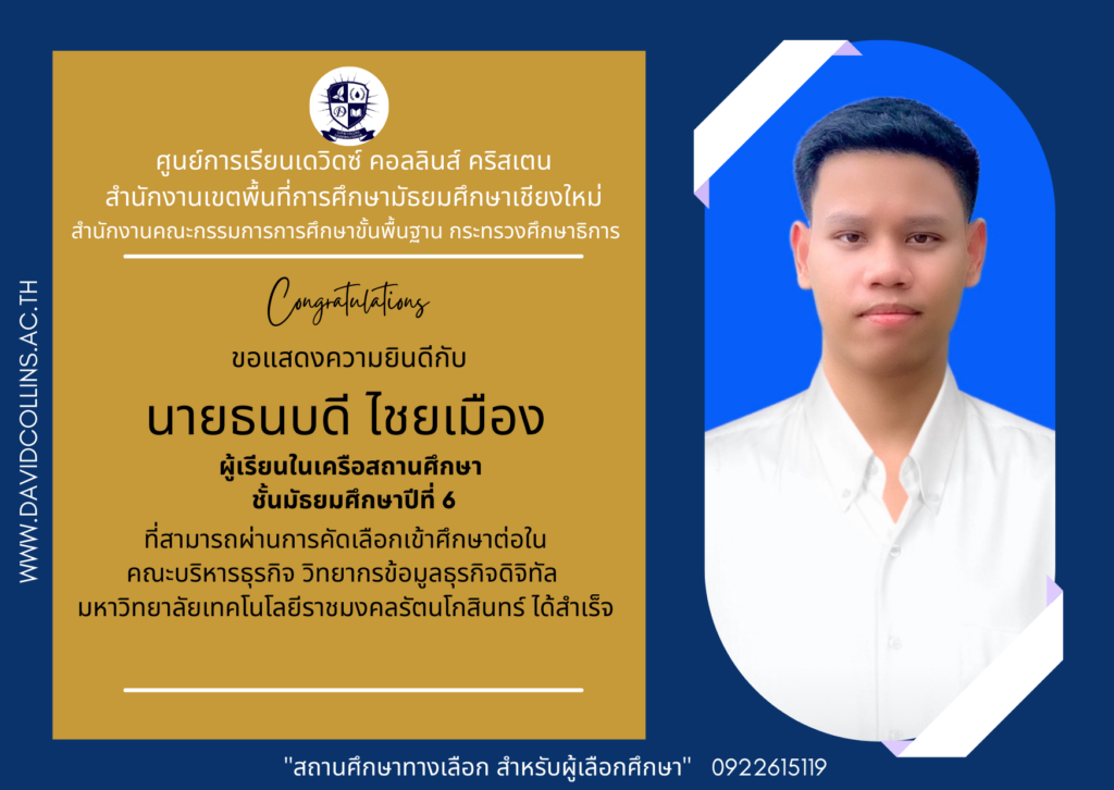 ขอแสดงความยินดีกับผู้เรียนในเครือ ที่สามารถผ่านการคัดเลือกเข้าศึกษาต่อใน คณะบริหารธุรกิจ วิทยากรข้อมูลธุรกิจดิจิทัจ มหาวิทยาลัยเทคโนโลยีราชมงคลรัตนโกสินทร์ ได้สำเร็จ