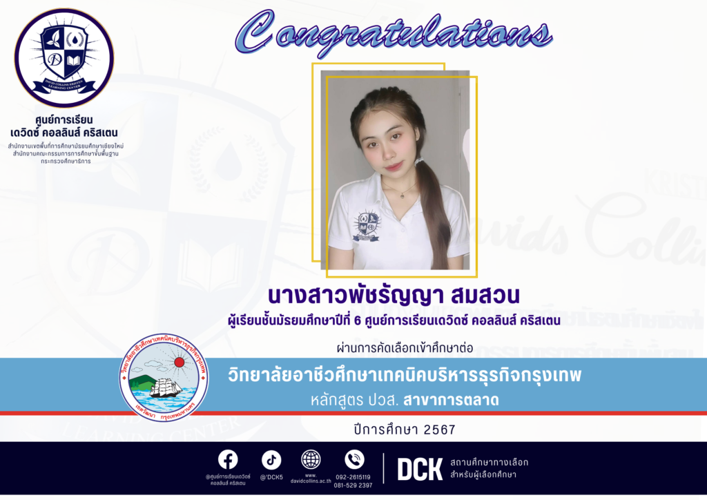 ขอแสดงความยินดีกับผู้เรียนที่ผ่านการคัดเลือกเข้าศึกษาต่อใน วิทยาลัยอาชีวศึกษาเทคนิคบริหารธุรกิจกรุงเทพ หลักสูตร ปวส.สาขาการตลาด ปีการศึกษา 2567 ได้สำเร็จ