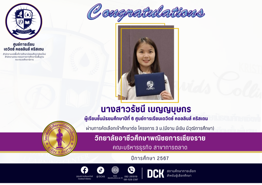 ขอแสดงความยินดีกับผู้เรียน ที่สามารถผ่านการคัดเลือกเข้าศึกษาต่อ โครงการ 3 ม. (มีงาน มีเงิน มีวุฒิการศึกษา) วิทยาลัยอาชีวศึกษาพณิชยการเชียงราย คณะบริหารธุรกิจ สาขาการตลาด ปีการศึกษา 2567 ได้สำเร็จ