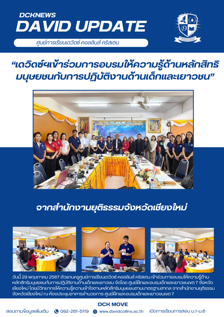 วันนี้ 29 พฤษภาคม 2567 ตัวแทนครูศูนย์การเรียนเดวิดซ์ คอลลินส์ คริสเตน เข้าร่วมการอบรมให้ความรู้ด้านหลักสิทธิมนุษยชนกับการปฏิบัติงานด้านเด็กและเยาวชน จัดโดย ศูนย์ฝึกและอบรมเด็กและเยาวชนเขต 7 จังหวัดเชียงใหม่ โดยมีวิทยากรให้ความรู้ความเข้าใจตามหลักสิทธิมนุษยชนตามมาตรฐานสากล จากสำนักงานยุติธรรมจังหวัดเชียงใหม่ ณ ห้องประชุมอาคารอำนวยการ ศูนย์ฝึกและอบรมเด็กและเยาวชนเขต 7
