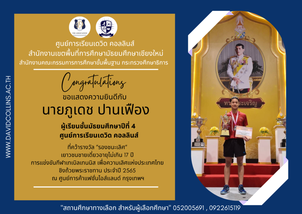 ศูนย์การเรียนเดวิด คอลลินส์ ขอแสดงความยินดีกับผู้เรียน นายภูเดช ปานเฟือง ที่คว้ารางวัล“รองชนะเลิศ“ ในรายการเยาวชนชายเดี่ยวอายุไม่เกิน 17 ปี การแข่งขันกีฬาเทเบิลเทนนิส เพื่อความเลิศแห่งประเทศไทย ชิงถ้วยพระราชทาน ประจำปี 2565 ระหว่าง 2-11 ธันวาคม 2565 ที่ผ่านมา ณ ศูนย์การค้าแฟชั่นไอส์แลนด์ กรุงเทพฯ