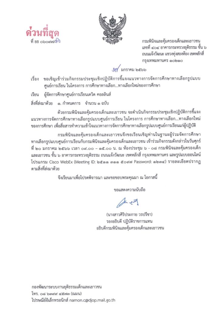 วันที่ 20 มกราคม 2566 เวลา 09.30 น. ดร.วัชรทัต ศรีเรือนสหนาวิน นายกสมาคมการศึกษาตลอดชีวิตและส่งเสริมกระบวนการเรียนรู้สิ่งแวดล้อมศึกษา, ผู้จัดการศึกษา ศูนย์การเรียนเดวิด คอลลินส์ พร้อมด้วยภาคีเครือข่ายผู้จัดการศึกษา และผู้บริหารศูนย์การเรียนร่วมประชุมเชิงปฏิบัติการชี้แจงแนวทางการจัดการศึกษาทางเลือกรูปแบบศูนย์การเรียน ในโครงการ “การศึกษาทางเลือก…ทางเลือกใหม่ของการศึกษา” โดยมี นางสาวศิริประกาย วรปรีชา รองอธิบดีกรมพินิจและคุ้มครองเด็กและเยาวชน เป็นประธานการ พร้อมทั้งมอบนโยบายแนวทางการจัดการศึกษาสำหรับเด็กและเยาวชนที่อยู่ในความดูแลของกรมพินิจฯ โดยมี นายยุทธศักดิ์ รุ่งเรืองนรา ผู้อำนวยการกองพัฒนาระบบงานยุติธรรมเด็กและเยาวชน กล่าวชี้แจงวัตถุประสงค์ของการประชุม พร้อมด้วยบุคลากรในศูนย์ฝึกและอบรมฯ สถานพินิจฯ และส่วนกลางที่เกี่ยวข้องกับการจัดการศึกษาให้กับเด็กและเยาวชน เข้าร่วม การประชุมดังกล่าวจัดโดย กองพัฒนาระบบงานยุติธรรมเด็กและเยาวชน ส่วนพัฒนาระบบงาน กลุ่มพัฒนาระบบงานการศึกษาและฝึกวิชาชีพ ณ ห้องประชุม 6 – 08 ชั้น 6 อาคารกระทรวงยุติธรรม ถนนแจ้งวัฒนะ เขตหลักสี่ กรุงเทพฯ และรูปแบบออนไลน์โปรแกรม Cisco WebEx