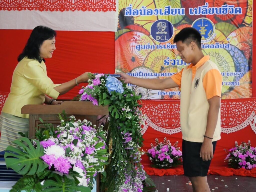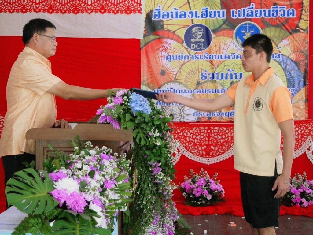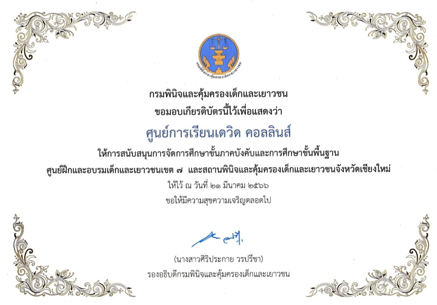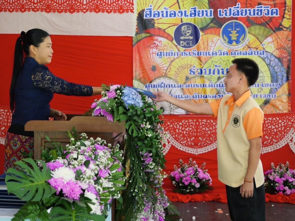 โอกาสนี้ ว่าที่ร้อยตรี ดร.กวี วุฒิเสน ผู้อํานวยการศูนย์การเรียนเดวิด คอลลินส์ ได้ขึ้นรับมอบเกียรติบัตรสําหรับผู้สนับสนุนการดําเนินงานกรมพินิจและคุ้มครองเด็กและเยาวชนโดย นางสาวศิริประกาย วรปรีชา รองอธิบดีกรมพินิจและคุ้มครองเด็กและเยาวชน กระทรวงยุติธรรม เป็นผู้มอบ
