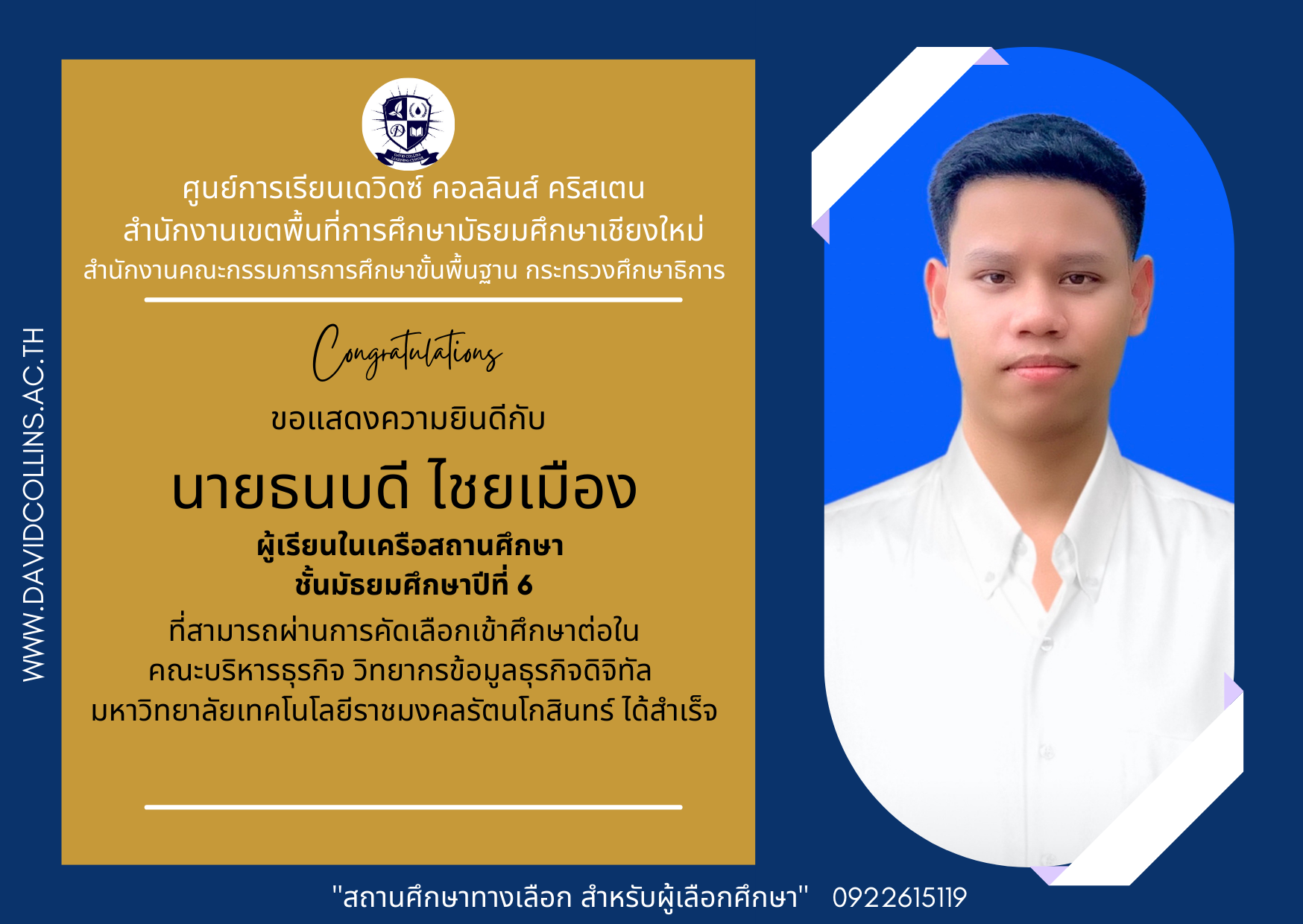 ศูนย์การเรียนเดวิดซ์ คอลลินส์ คริสเตน ขอแสดงความยินดีเด็กหญิงฐิติวรดา ภูวฤทธิ์ ผู้เรียนชั้นมัธยมศึกษาปีที่ 3 สอบเข้าศึกษาต่อที่โรงเรียนแก่นนครวิทยาลัย จังหวัดขอนแก่น แผนการเรียนภาษาอังกฤษ-เยอรมัน ปีการศึกษา 2568 ได้สำเร็จ ขอให้ก้าวต่อไปอย่างมั่นคงและประสบความสำเร็จในเส้นทางการศึกษาและชีวิตในอนาคต