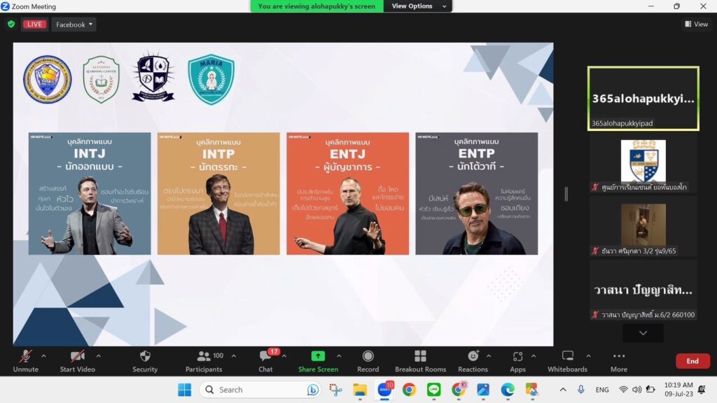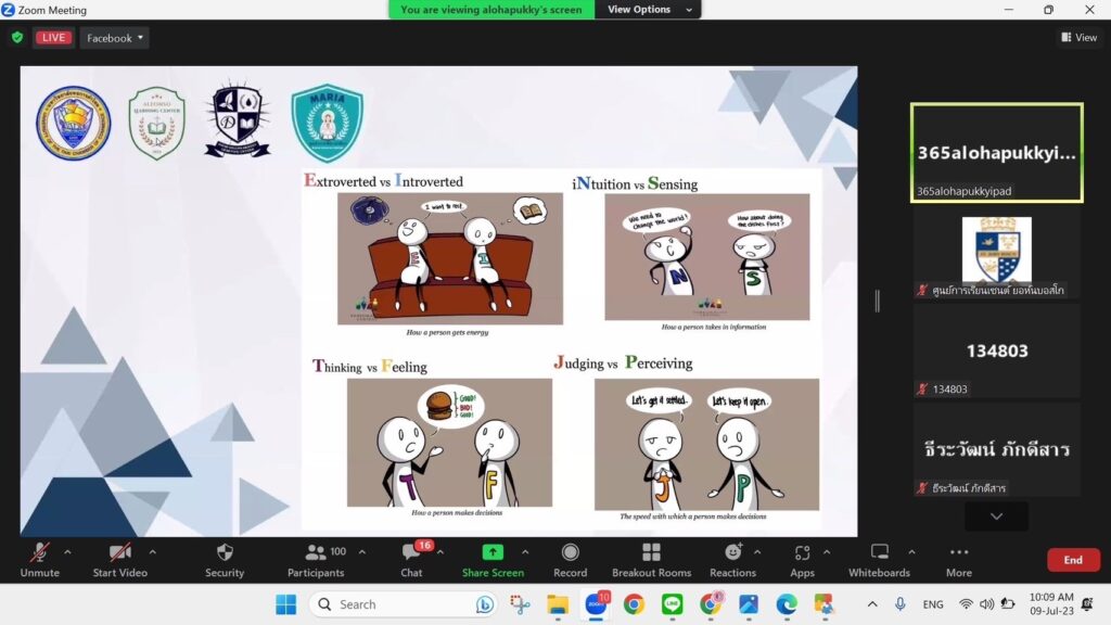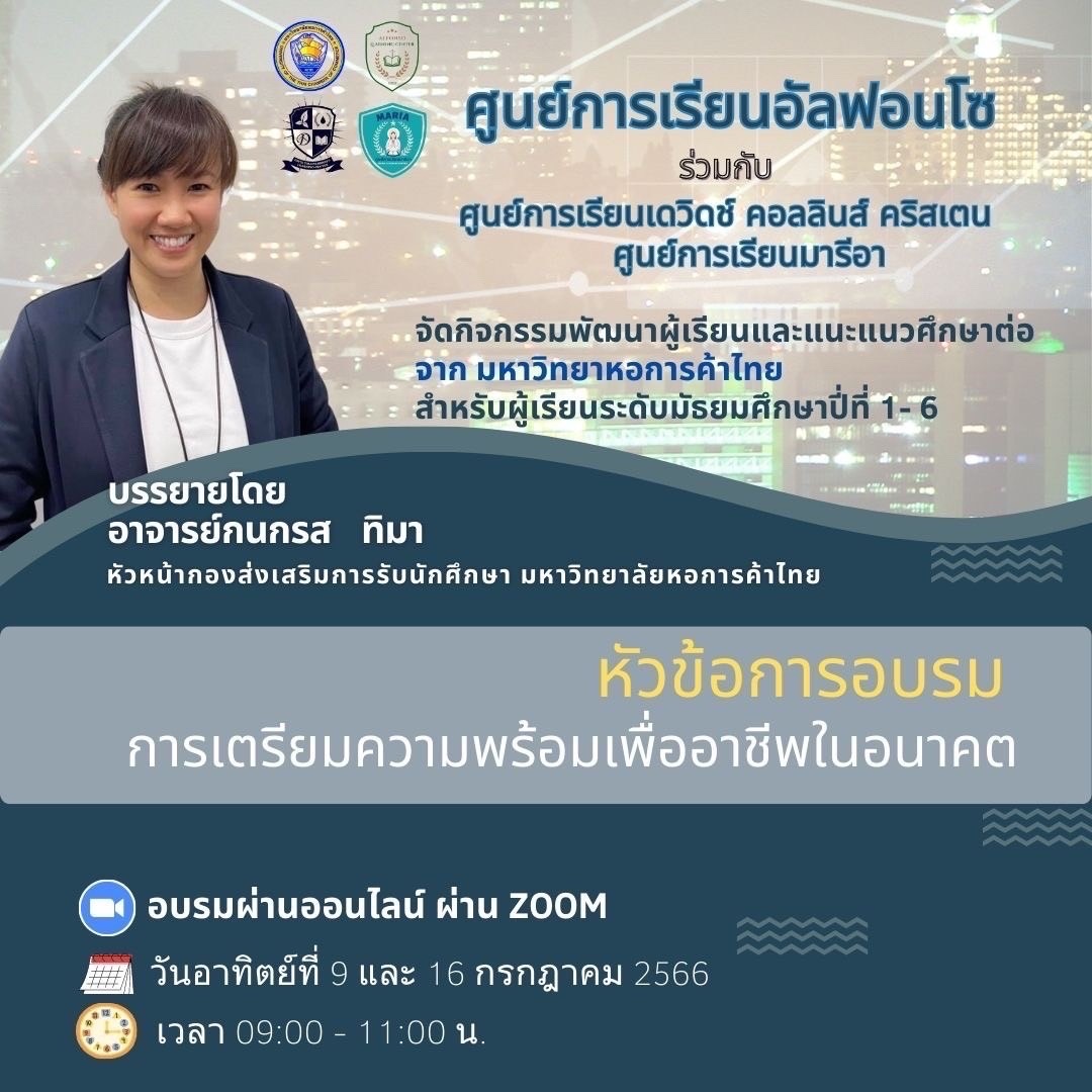 ในวันอาทิตย์ที่ 9 กรกฎาคม พ.ศ.2566 ศูนย์การเรียนเดวิดซ์ คอลลินส์ คริสเตน ร่วมกับ ศูนย์การเรียนอัลฟอนโซ ได้จัดกิจกรรมพัฒนาผู้เรียนเรื่อง “การเตรียมความพร้อมเพื่ออาชีพในอนาคต” โดยมี ท่านวิทยากร อาจารย์กนกรส ทิมา หัวหน้ากองส่งเสริมการรับนักศึกษา มหาวิทยาลัยหอการค้าไทย ให้กับผู้เรียนระดับชั้นมัธยมศึกษาตอนต้นและตอนปลาย (ม.1 – ม.6) ภาคเรียนที่ 1/2566 ผ่านระบบการประชุมทางไกล (Zoom meeting)