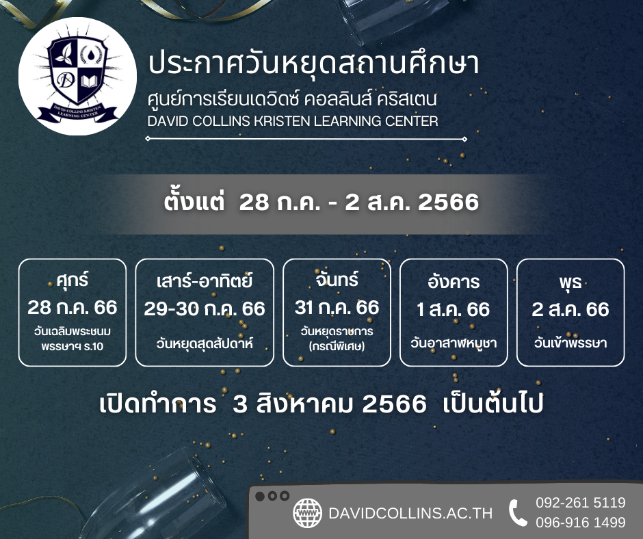 ประกาศวันหยุดสถานศึกษา ศูนย์การเรียนเดวิดซ์ คอลลินส์ คริสเตน