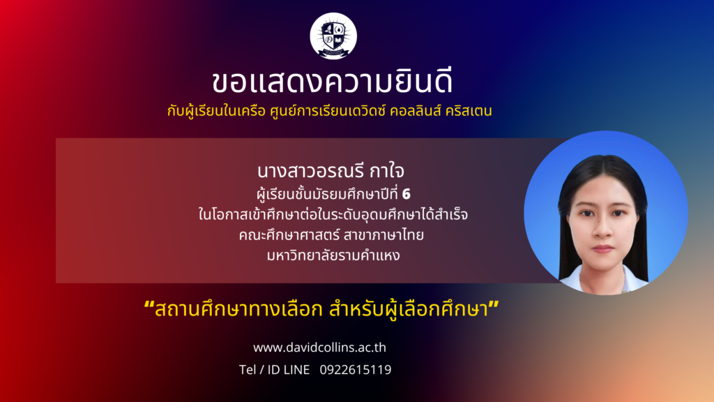 ขอแสดงความยินดีกับผู้เรียนในเครือ ศูนย์การเรียนเดวิดซ์ คอลลินส์ คริสเตน ในโอกาสที่เข้าศึกษาต่อในคณะศึกษาศาสตร์ สาขาภาษาไทย มหาวิทยาลัยรามคำแหง ได้สำเร็จ