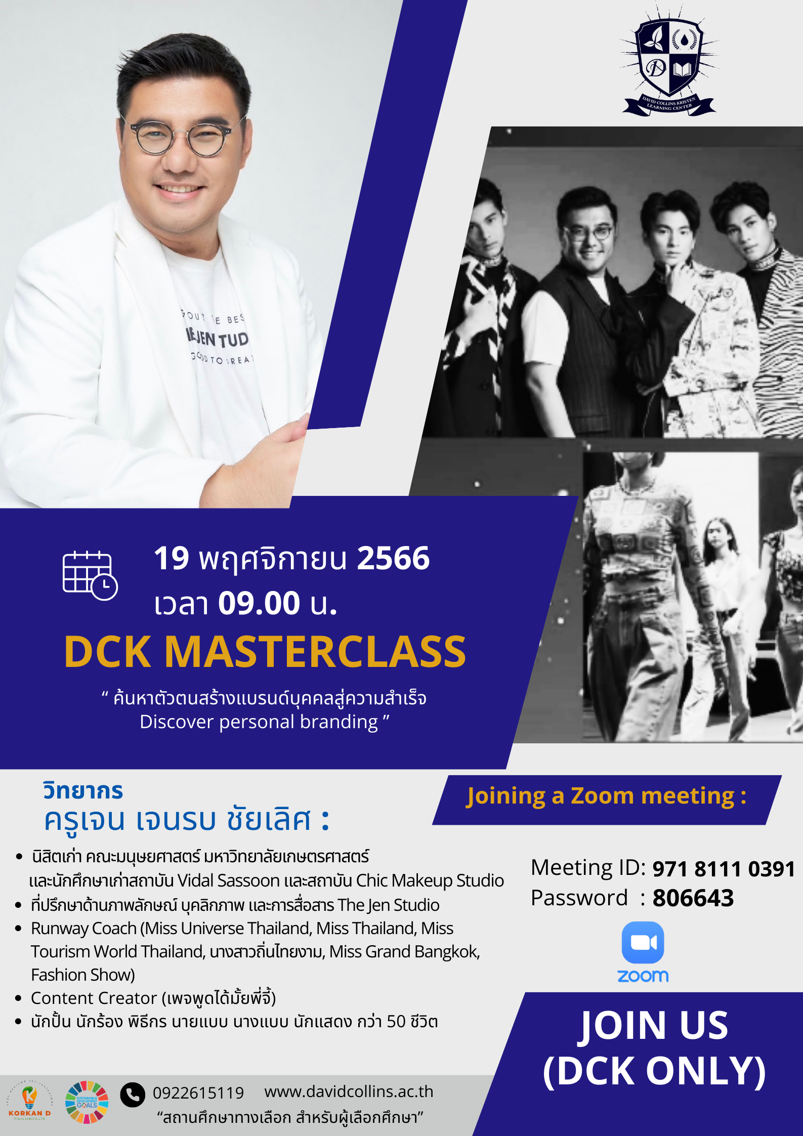 ศูนย์การเรียนเดวิดซ์ คอลลินส์ คริสเตน ขอเชิญชวนผู้เรียนและผู้ปกครองทุกระดับชั้น ร่วม DCK MASTERCLASS สุดพิเศษ “ ค้นหาตัวตนสร้างแบรนด์บุคคลสู่ความสำเร็จ Discover personal branding”โดยได้รับเกียรติจาก ครูเจน เจนรบ ชัยเลิศ วิทยากรระดับประเทศ ที่มีความเชี่ยวชาญ