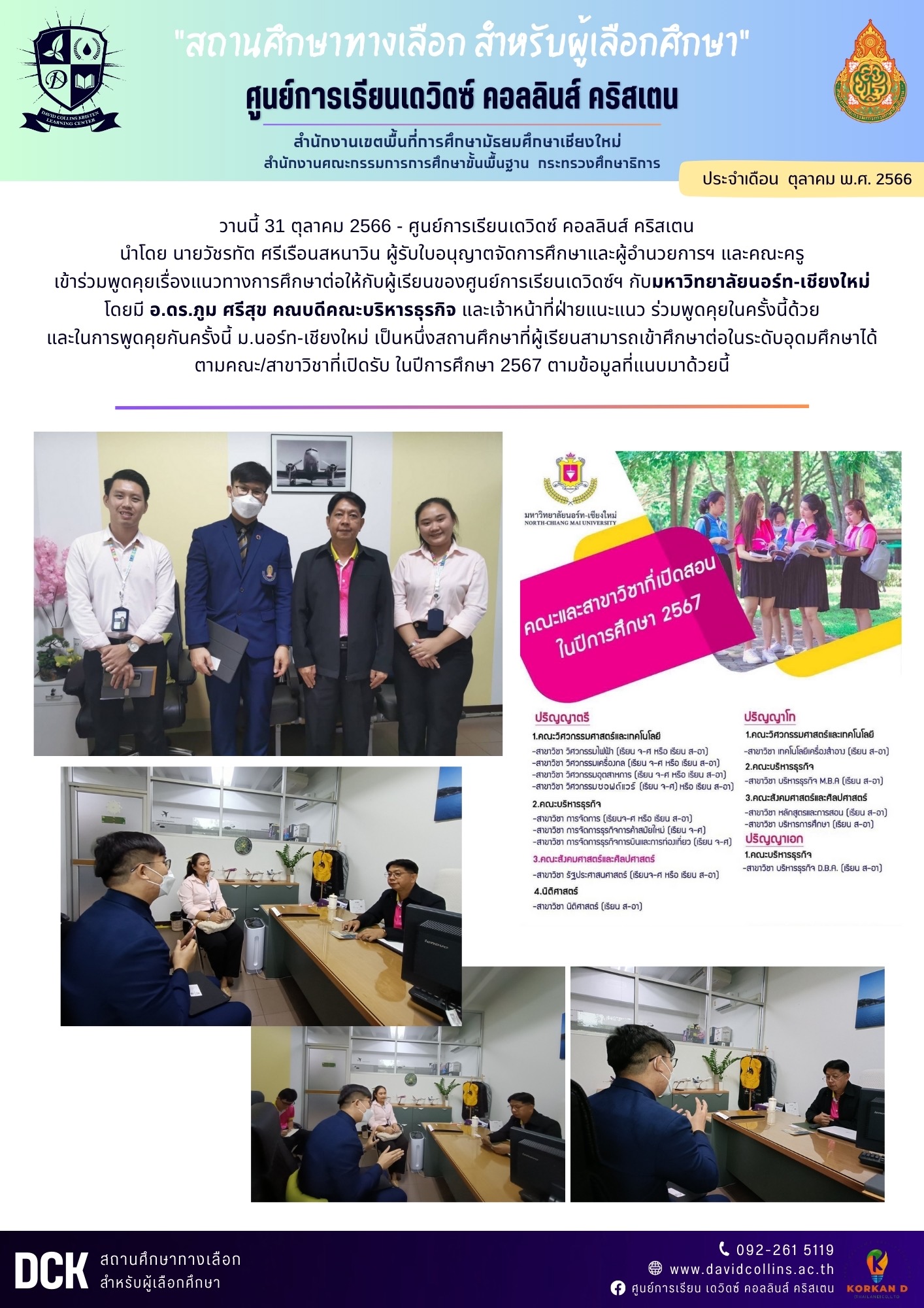 ศูนย์การเรียนเดวิดซ์ คอลลินส์ คริสเตน ร่วมพูดคุยในแนวทางการศึกษาต่อให้กับผู้เรียน ร่วมกับ มหาวิทยาลัยนอร์ท-เชียงใหม่