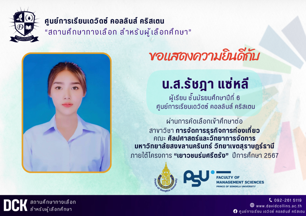 ขอแสดงความยินดีกับผู้เรียน ศูนย์การเรียนเดวิดซ์ คอลลินส์ คริสเตน ที่ผ่านการคัดเลือกเข้าศึกษาต่อ สาขาวิชา การจัดการธุรกิจการท่องเที่ยว คณะศิลปศาสตร์และวิทยาการจัดการ มหาวิทยาลัยสงขลานรินทร์ วิทยาเขตสุราษฎร์ธานี ภายใต้โครงการ “เยาวชนร่มศรีตรัง” ปีการศึกษา 2567