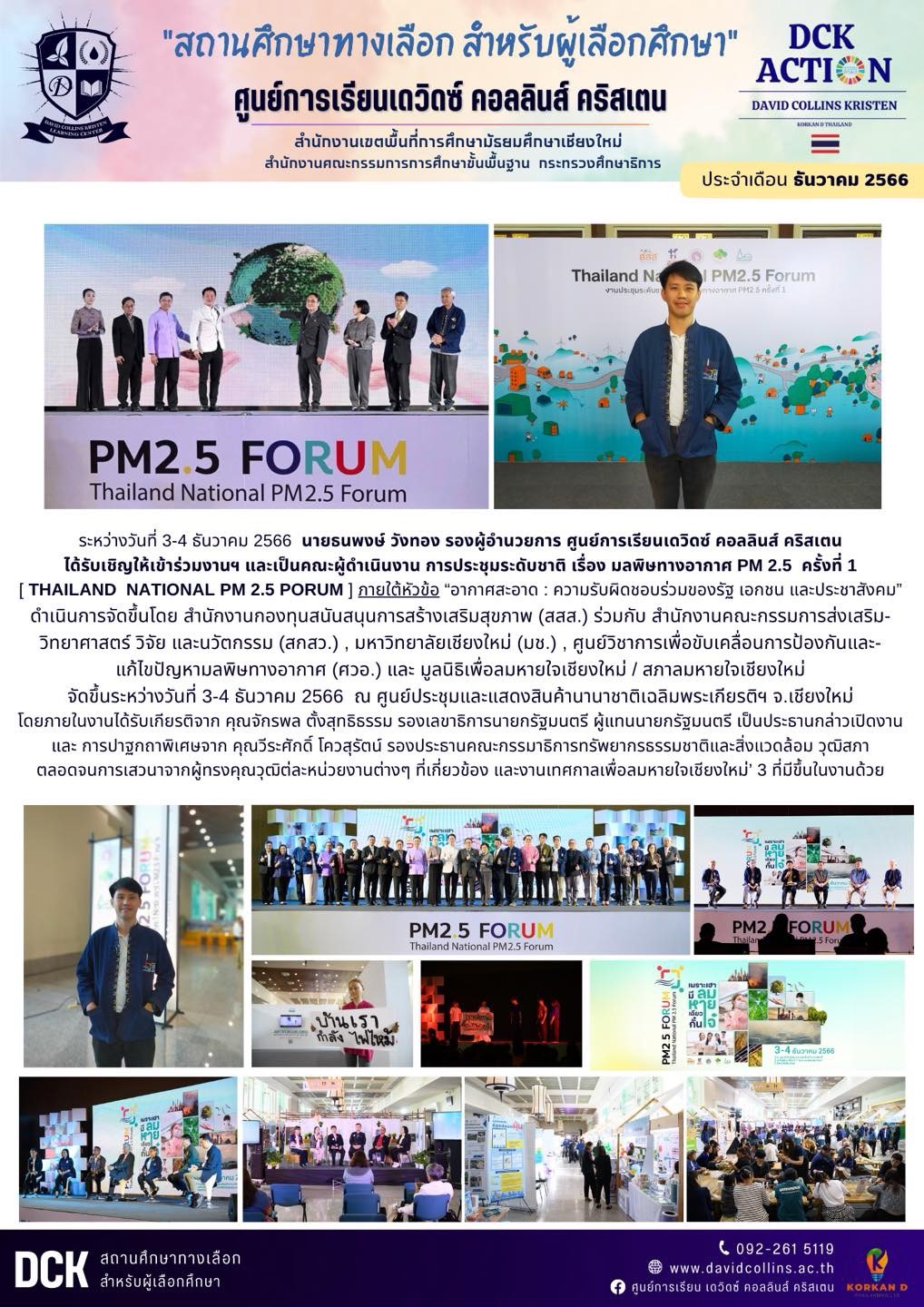 ในวันที่ 3-4 ธันวาคม 2566 นายธนพงษ์ วังทอง รองผู้อำนวยการ ศูนย์การเรียนเดวิดซ์ คอลลินส์ คริสเตน ได้รับเชิญให้เข้าร่วมงานฯ และเป็นคณะผู้ดำเนินงาน การประชุมระดับชาติ เรื่อง มลพิษทางอากาศ PM 2.5 ครั้งที่ 1