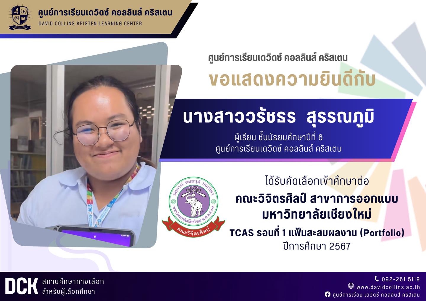 ขอแสดงความยินดีกับผู้เรียน นางสาววรัชธร สุวรรณภูมิ ผู้เรียนชั้นมัธยมศึกษาปีที่ 6 ศูนย์การเรียนเดวิดซ์ คอลลินส์ คริสเตน ที่ผ่านการคัดเลือกเข้าศึกษาต่อ ในคณะวิจิตรศิลป์ สาขาการออกแบบ ภาคปกติ มหาวิทยาลัยเชียงใหม่ ปีการศึกษา 2567