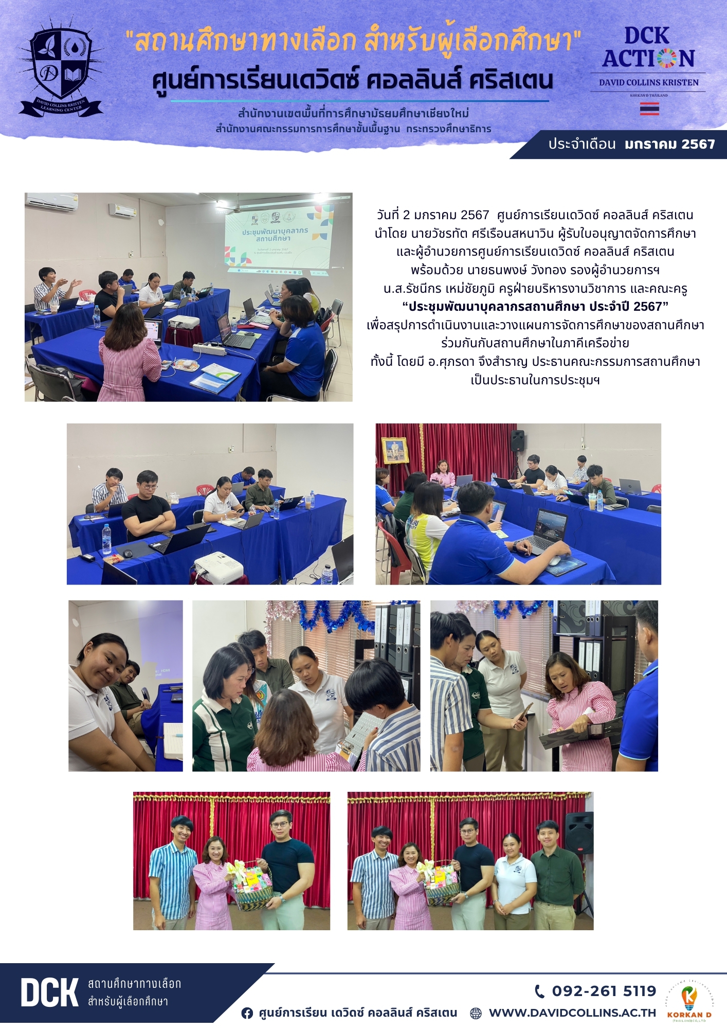 2 มกราคม 2567 การประชุมพัฒนาบุคลากรสถานศึกษา ประจำปี 2567 ระหว่างศูนย์การเรียนเดวิดซ์ คอลลินส์ คริสเตน กับสถานศึกษาในเครือ