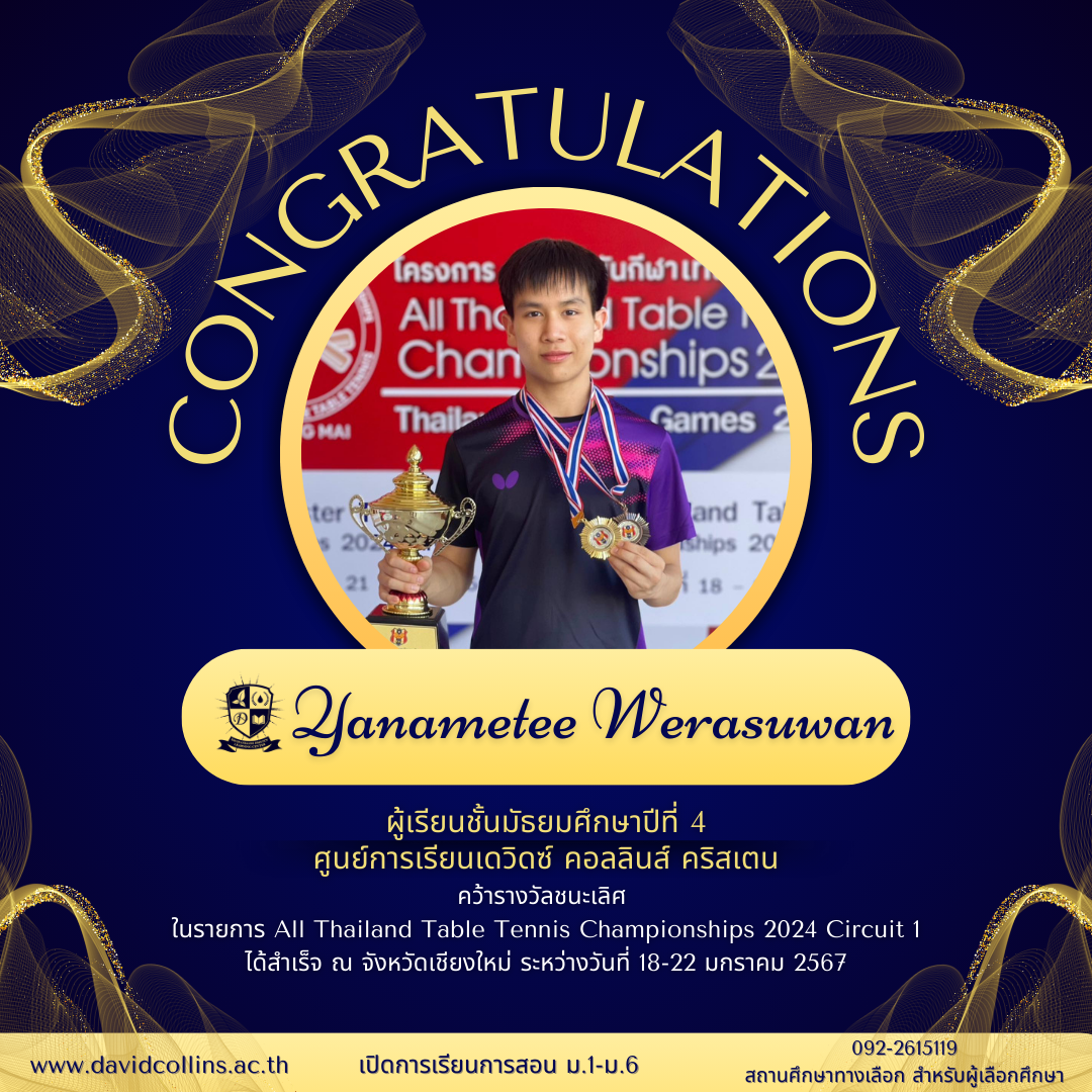 ขอแสดงความยินดีกับผู้เรียนศูนย์การเรียนเดวิดซ์ คอลลินส์ คริสเตน ที่คว้ารางวัลชนะเลิศ ในรายการ All Thailand Table Tennis Championships 2024 Circuit 1 ได้สำเร็จ ณ จังหวัดเชียงใหม่ ได้สำเร็จ