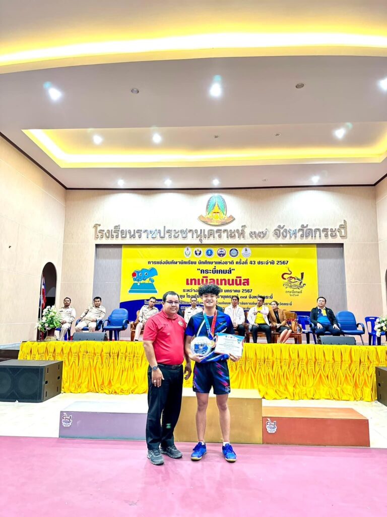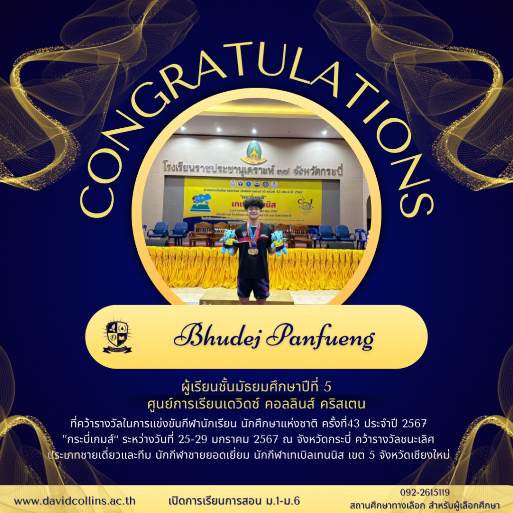 ขอแสดงความยินดีกับ นายภูเดช ปานเฟื่อง ผู้เรียนชั้นมัธยมศึกษาปีที่ 5 ศูนย์การเรียนเดวิดซ์ คอลลินส์ คริสเตน ที่คว้ารางวัลในการแข่งขันกีฬานักเรียน นักศึกษาแห่งชาติ ครั้งที่43 ประจำปี 2567 ”กระบี่เกมส์“ ระหว่างวันที่ 25-29 มกราคม 2567 ณ จังหวัดกระบี่ คว้ารางวัลชนะเลิศประเภทชายเดี่ยวและทีม นักกีฬาชายยอดเยี่ยม นักกีฬาเทเบิลเทนนิส เขต 5 จังหวัดเชียงใหม่ ได้สำเร็จ