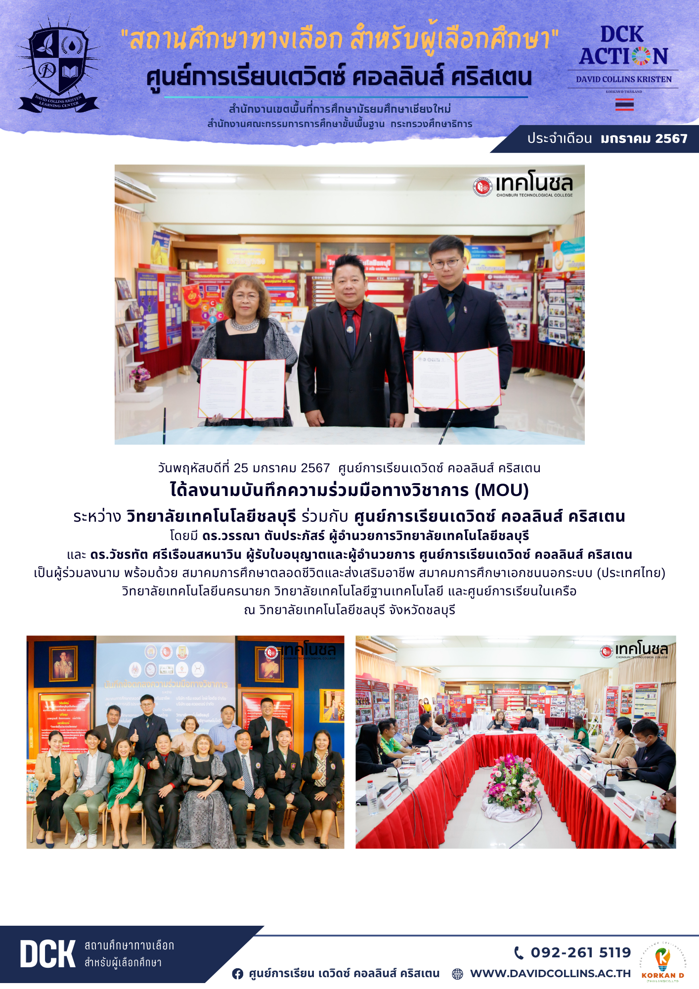 วันพฤหัสบดีที่ 25 มกราคม 2567 ศูนย์การเรียนเดวิดซ์ คอลลินส์ คริสเตน ได้ลงนามบันทึกความร่วมมือทางวิชาการ (MOU) ระหว่าง วิทยาลัยเทคโนโลยีชลบุรี ร่วมกับ ศูนย์การเรียนเดวิดซ์ คอลลินส์ คริสเตน โดยมี ดร.วรรณา ตันประภัสร์ ผู้อำนวยการวิทยาลัยเทคโนโลยีชลบุรี และ ดร.วัชรทัต ศรีเรือนสหนาวิน ผู้รับใบอนุญาตและผู้อำนวยการ ศูนย์การเรียนเดวิดซ์ คอลลินส์ คริสเตน เป็นผู้ร่วมลงนาม พร้อมด้วย สมาคมการศึกษาตลอดชีวิตและส่งเสริมอาชีพ สมาคมการศึกษาเอกชนนอกระบบ (ประเทศไทย) วิทยาลัยเทคโนโลยีนครนายก วิทยาลัยเทคโนโลยีฐานเทคโนโลยี และศูนย์การเรียนในเครือ ณ วิทยาลัยเทคโนโลยีชลบุรี จังหวัดชลบุรี