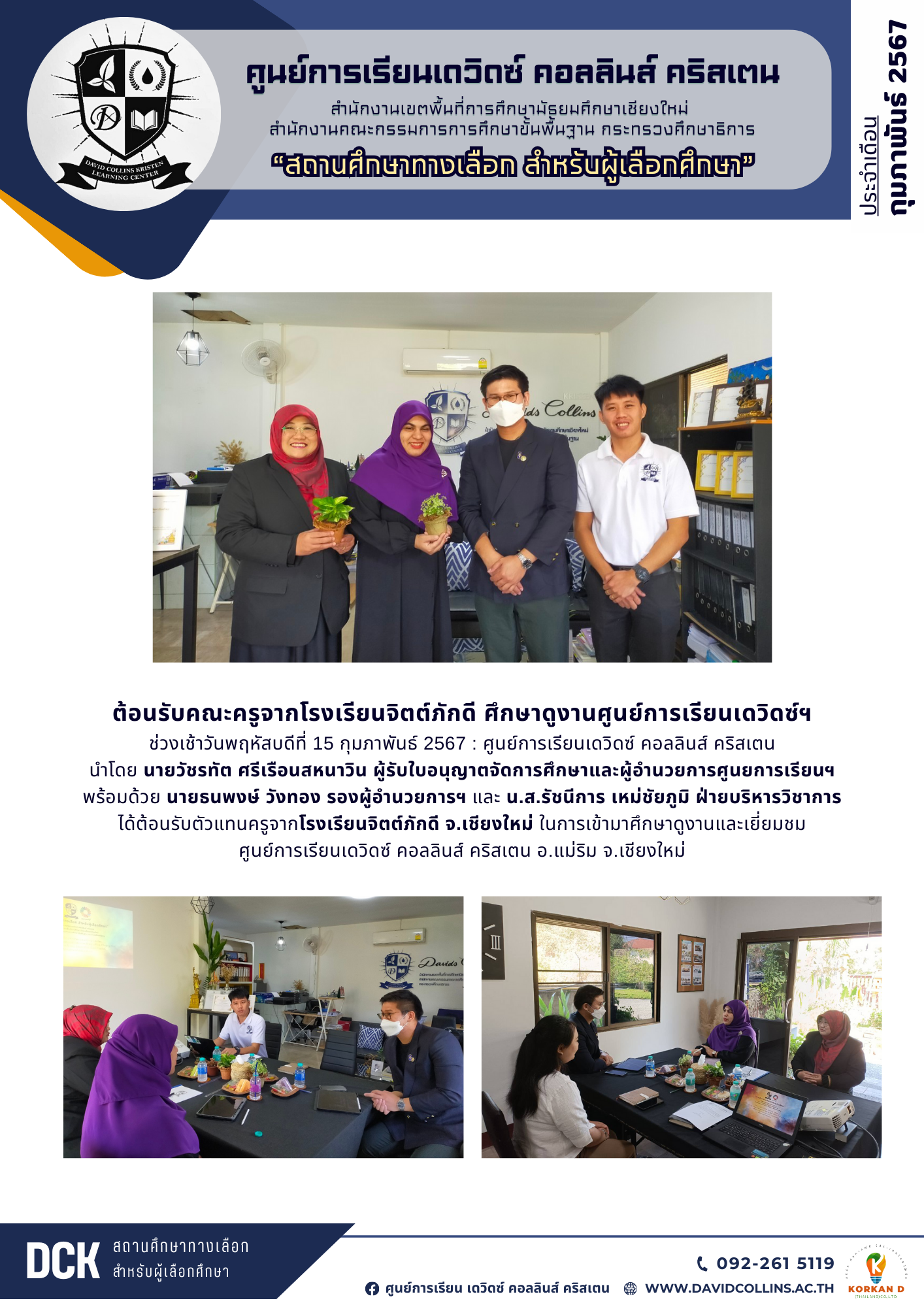 ต้อนรับคณะครูจากโรงเรียนจิตต์ภักดี ศึกษาดูงานศูนย์การเรียนเดวิดซ์ฯ วันพฤหัสบดีที่ 15 กุมภาพันธ์ 2567ที่ผ่านมา : ศูนย์การเรียนเดวิดซ์ คอลลินส์ คริสเตน นำโดย นายวัชรทัต ศรีเรือนสหนาวิน ผู้รับใบอนุญาตจัดการศึกษาและผู้อำนวยการศูนยการเรียนฯ พร้อมด้วย นายธนพงษ์ วังทอง รองผู้อำนวยการฯ และ น.ส.รัชนีการ เหม่ชัยภูมิ ฝ่ายบริหารวิชาการ ได้ให้การต้อนรับตัวแทนครูจากโรงเรียนจิตต์ภักดี จ.เชียงใหม่ ในการเข้ามาศึกษาดูงานและเยี่ยมชม ศูนย์การเรียนเดวิดซ์ คอลลินส์ คริสเตน อ.แม่ริม จ.เชียงใหม่