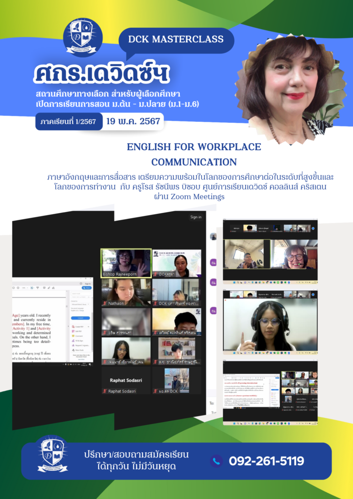 19 พฤษภาคม 2567 อัพเดตความรู้ ภาษาอังกฤษและการสื่อสาร เตรียมความพร้อมในโลกของการศึกษาต่อในระดับที่สูงขึ้นและโลกของการทำงาน กับ ครูโรส รัชนีพร บิชอบ ศูนย์การเรียนเดวิดซ์ คอลลินส์ คริสเตน ผ่าน Zoom Meetings