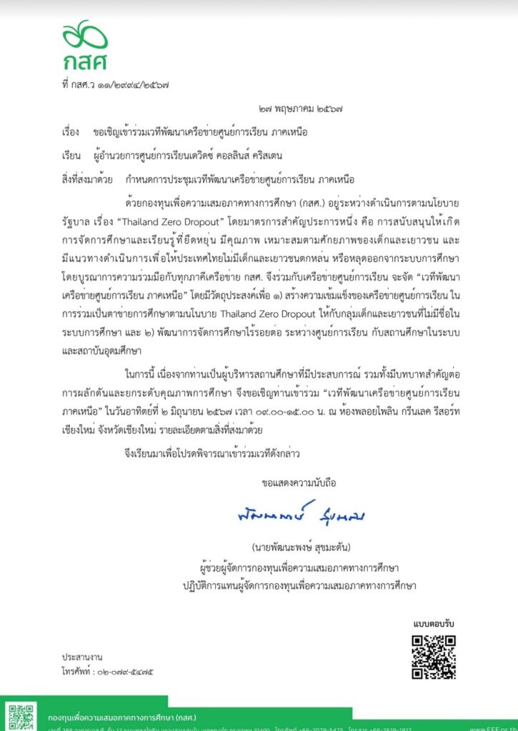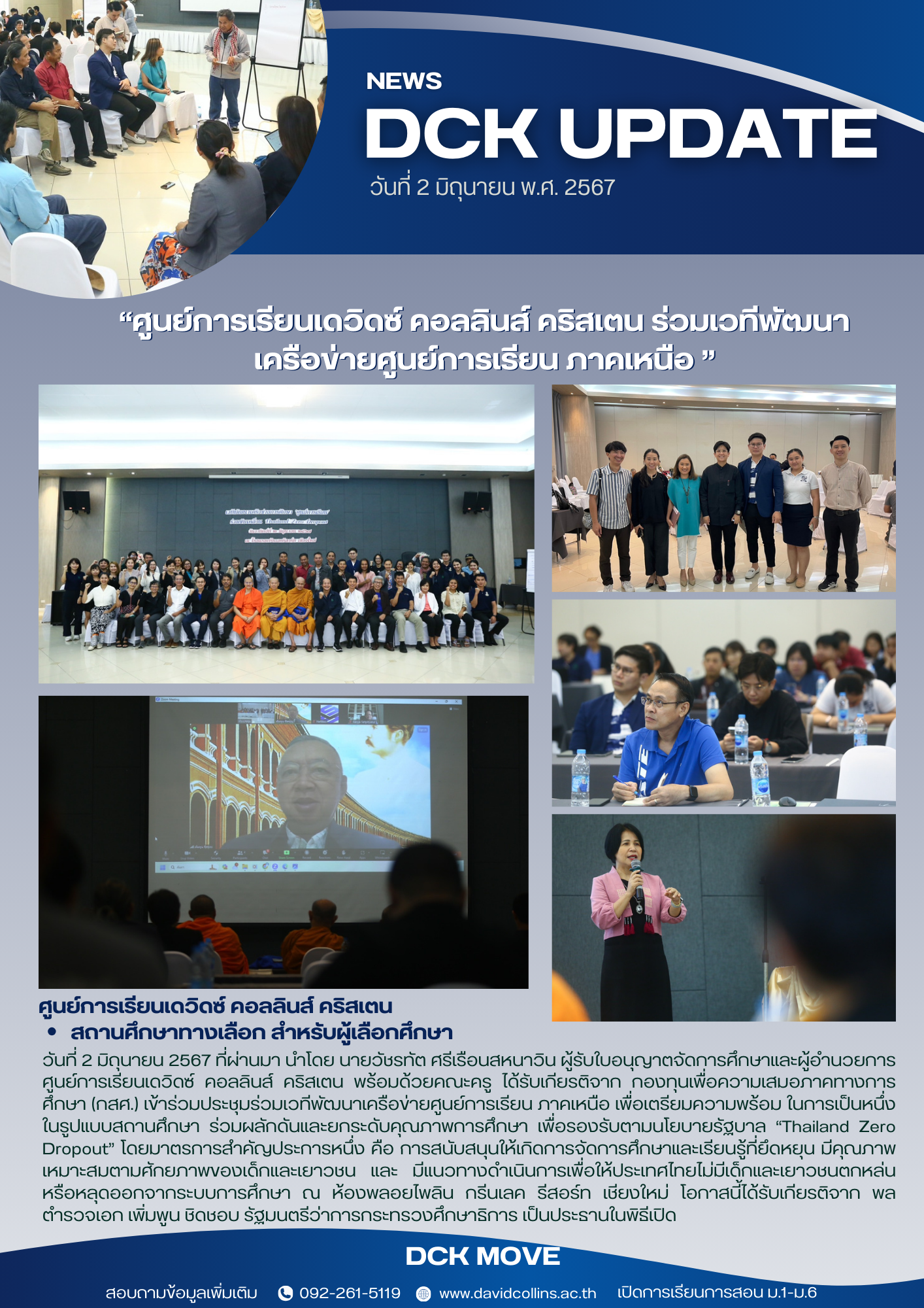 วันที่ 2 มิถุนายน 2567 ที่ผ่านมา นำโดย ดร.วัชรทัต ศรีเรือนสหนาวิน ผู้รับใบอนุญาตจัดการศึกษาและผู้อำนวยการศูนย์การเรียนเดวิดซ์ คอลลินส์ คริสเตน พร้อมด้วยคณะครู ได้รับเกียรติจาก กองทุนเพื่อความเสมอภาคทางการศึกษา (กสศ.) เข้าร่วมประชุมร่วมเวทีพัฒนาเครือข่ายศูนย์การเรียน ภาคเหนือ เพื่อเตรียมความพร้อม ในการเป็นหนึ่งในรูปแบบสถานศึกษา ร่วมผลักดันและยกระดับคุณภาพการศึกษา เพื่อรองรับตามนโยบายรัฐบาล “Thailand Zero Dropout” โดยมาตรการสำคัญประการหนึ่ง คือ การสนับสนุนให้เกิดการจัดการศึกษาและเรียนรู้ที่ยึดหยุน มีคุณภาพ เหมาะสมตามศักยภาพของเด็กและเยาวชน และ มีแนวทางดำเนินการเพื่อให้ประเทศไทยไม่มีเด็กและเยาวชนตกหล่น หรือหลุดออกจากระบบการศึกษา ณ ห้องพลอยไพลิน กรีนเลค รีสอร์ท เชียงใหม่ โอกาสนี้ได้รับเกียรติจาก พลตำรวจเอก เพิ่มพูน ชิดชอบ รัฐมนตรีว่าการกระทรวงศึกษาธิการ เป็นประธานในพิธีเปิด