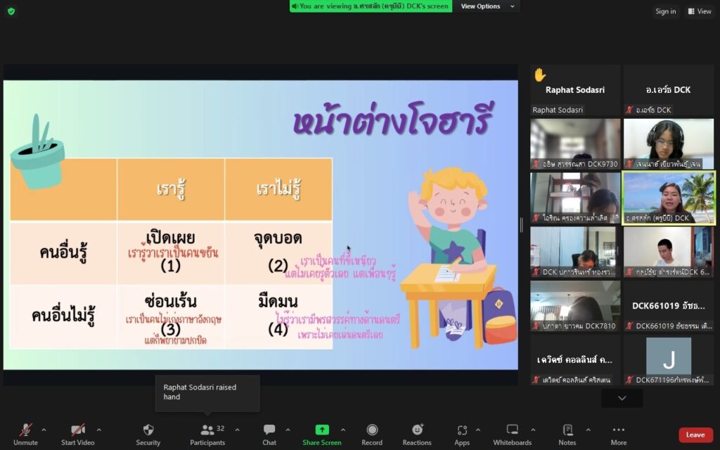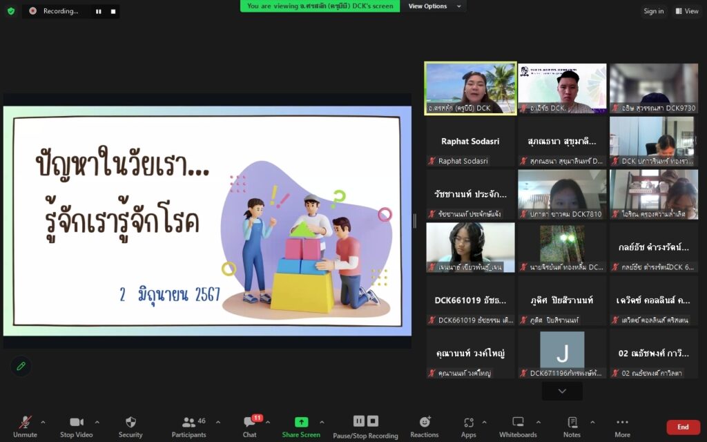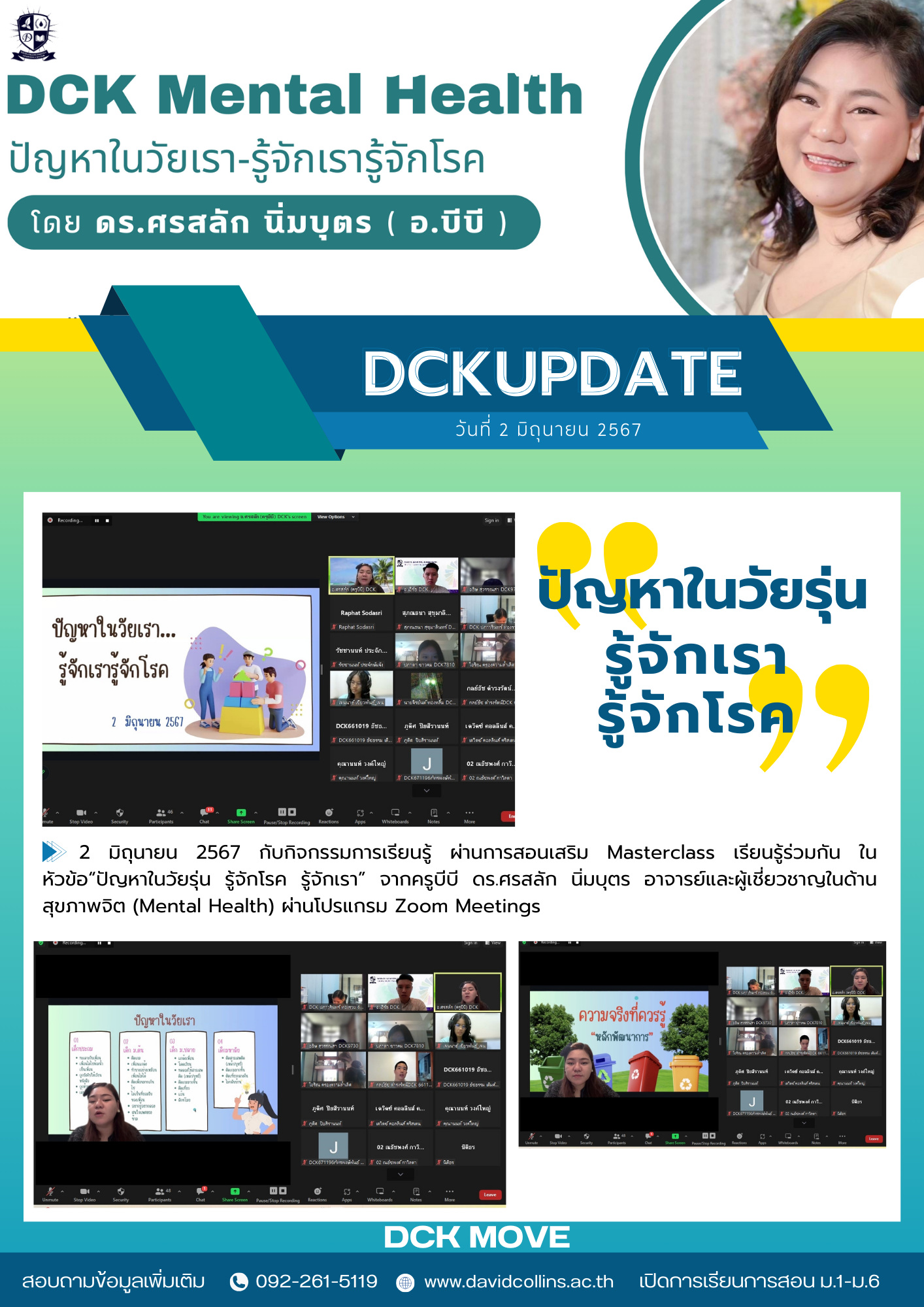 2 มิถุนายน 2567 กับกิจกรรมการเรียนรู้ ผ่านการสอนเสริม Masterclass เรียนรู้ร่วมกัน ในหัวข้อ“ปัญหาในวัยรุ่น รู้จักโรค รู้จักเรา” จากครูบีบี ดร.ศรสลัก นิ่มบุตร อาจารย์และผู้เชี่ยวชาญในด้านสุขภาพจิต (Mental Health) ผ่านโปรแกรม Zoom Meetings